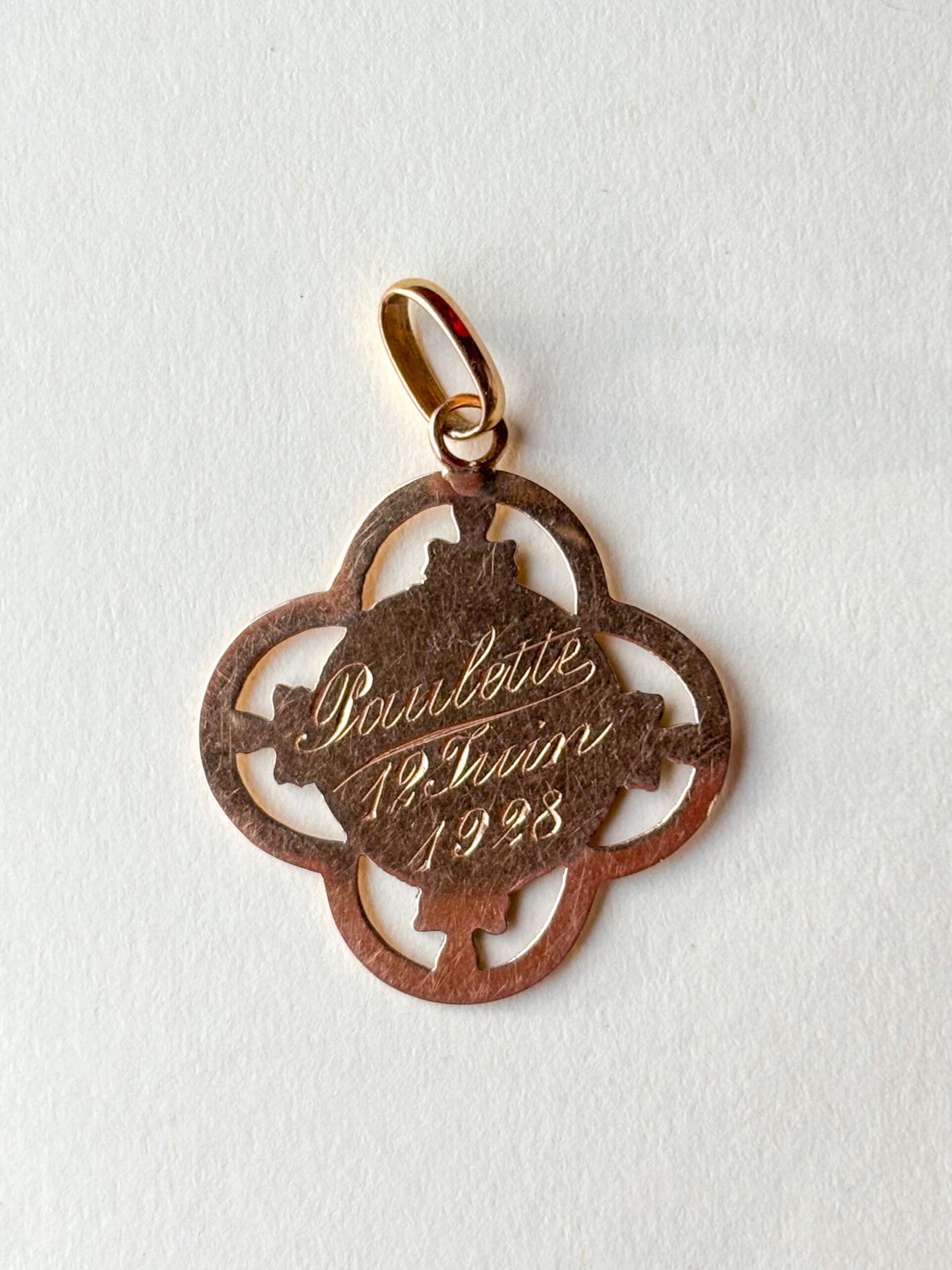 La Vierge, au visage doux et recueilli, est entourée d’un décor floral finement travaillé. Le médaillon extérieur adopte une forme quadrilobée élégante, ponctuée de motifs de trèfle, symboles traditionnels de foi, d’espérance et de protection. Cet ensemble confère au bijou une esthétique à la fois raffinée et profondément symbolique.